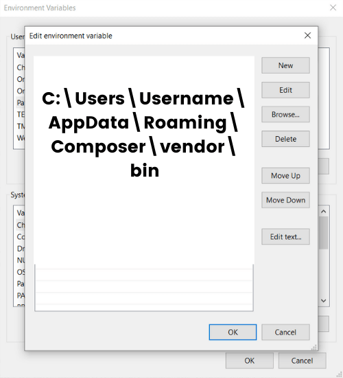 We have to make sure we have the composer path added. If not you have to add it. Press Windows Key and Search environment variables. Select environment variables and then select path as shown in the image.